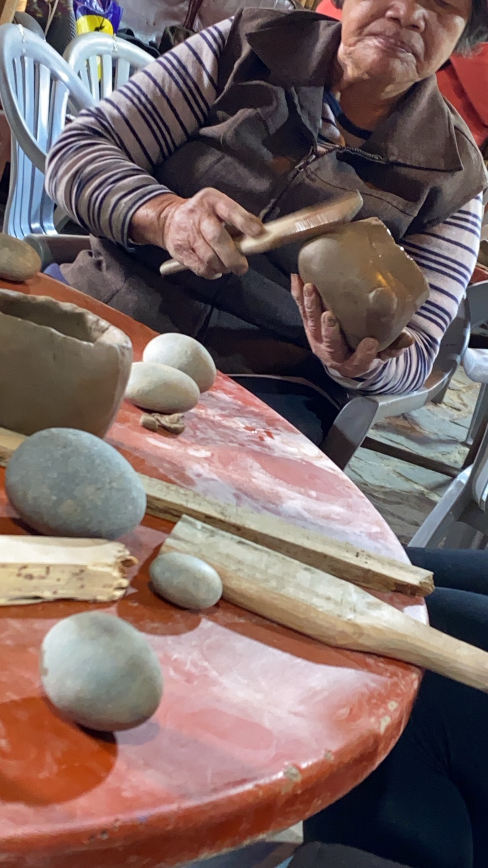 回到部落,會燒陶的部落奶奶就開始跟我們介紹起了阿美陶,只見他們輕鬆捏個幾下,搭配上鵝卵石跟器具的敲打,一個陶器的雛形馬上就出來了,不同的形狀有不同的功用,看起來很簡單,但我們實際在做的時候,並沒有這麼容易,土比我所想像的更難控制,弄好都有困難了,更別提弄出一個完美的形狀,果然,凡事還是必須靠經驗所累積的。