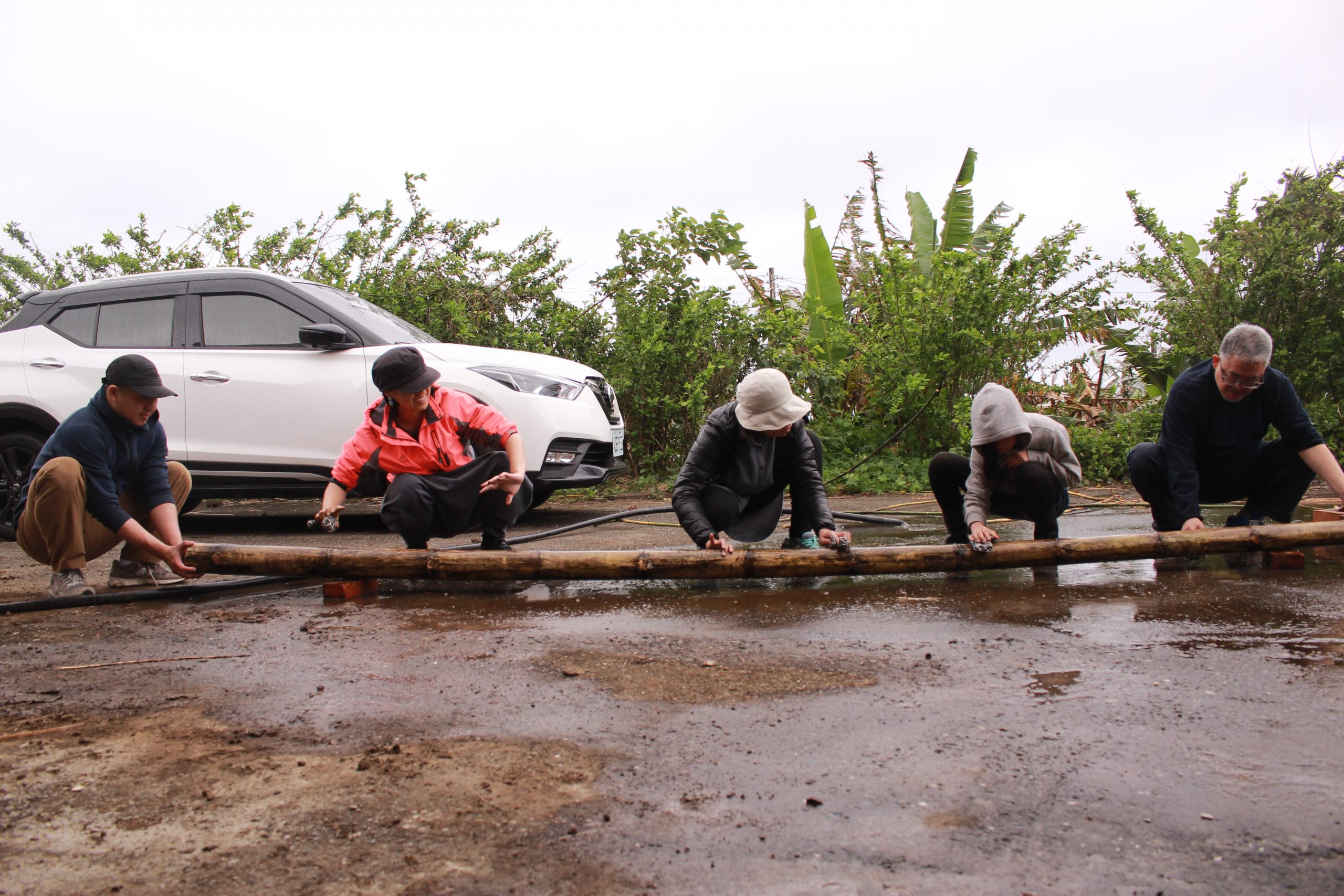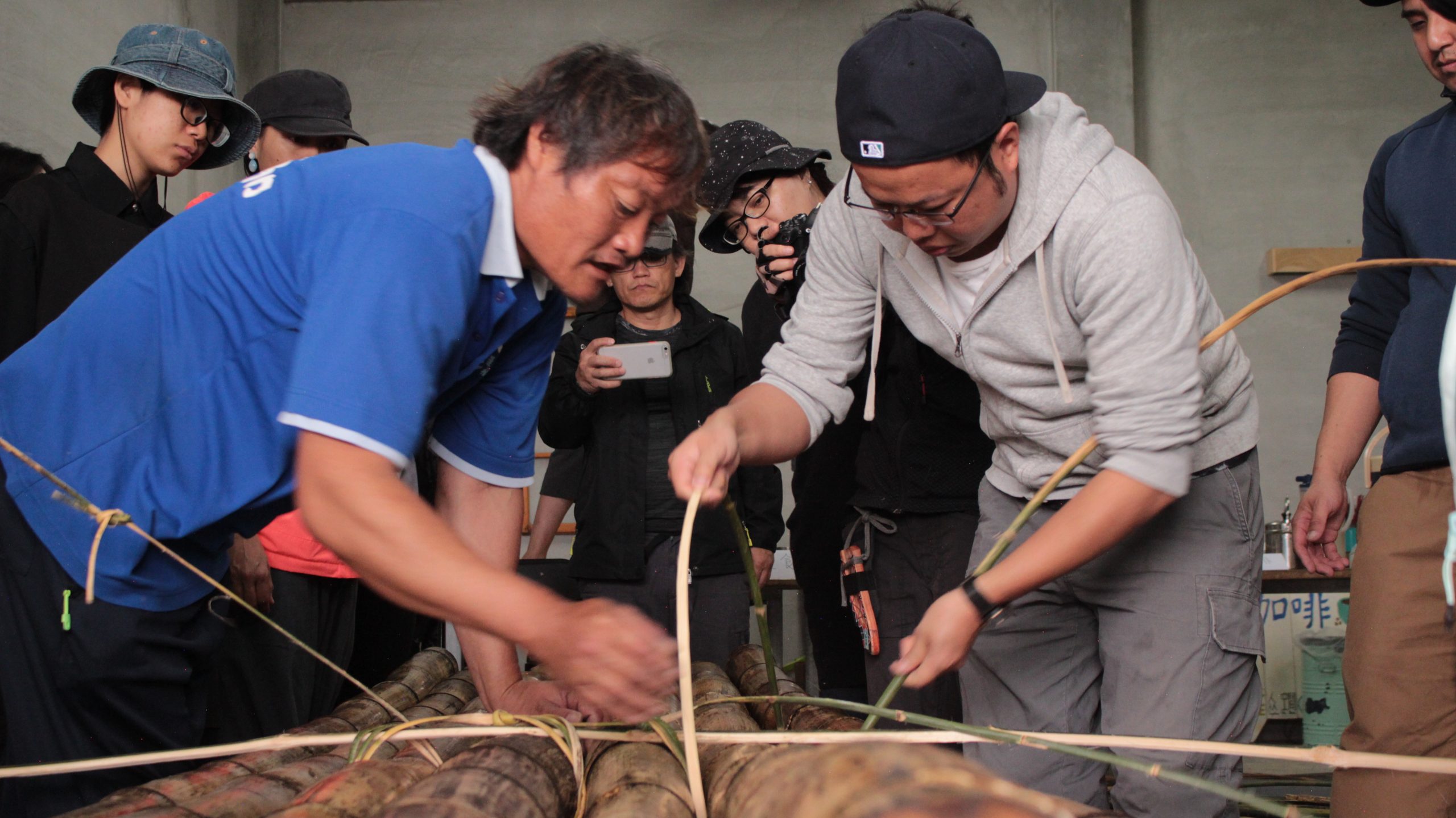 ⼀⾏⼈在慢慢地回到志⼯中⼼,保羅和林清進阿公開始教學如何剝⽪和處理黃藤,⼤家⼀開始⼤家都不太會處理,有時候削得太多、姿勢不對,慢慢的藝術家們認真的在處理黃藤,彷彿看⾒⼀個創作的狀態在其中,所有⼈都全神貫注地在學習處理。在最後⼀天,⼤家⽤⼼地清理⽵⼦,保羅也教著藝術家們如何綑綁、對位⽵⼦的位置編排,但在這⼀天最⼤的不同是,保羅可以在整個造船的⼯作中,慢慢的從主⼒⾓⾊變成輔助⾓⾊,隱約能看⾒,他眼裡看著⼤家慢慢的能夠完成許多⼯作的那種能夠看著⼤家合作完成⽵筏的那種滿⾜的感覺。